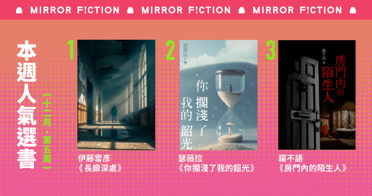 鏡文學本週人氣選書♕TOP1《長廊深處》TOP2《你擱淺了我的韶光》TOP3《房門內的陌生人》TOP4《靈圖》TOP5《我認罪,法官閣下》